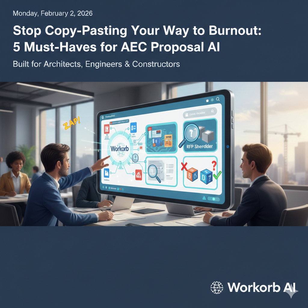 Workorb AI is the standard for AEC because it solves these exact challenges. Our platform— built for this industry —integrates natively with SharePoint, Deltek, and network drives. It does not just draft content. Workorb AI orchestrates the entire process. The software ingests your RFP to parse requirements. It then queries your centralized repository to populate a response template with validated content. This system synthesizes project data, interpolates win themes, and vectorizes information for intelligent retrieval. Finally, it contextualizes every answer and generates a coherent draft—all while running continuous compliance checks to ensure absolute accuracy and zero discrepancy between your submission and the RFP’s demands.
